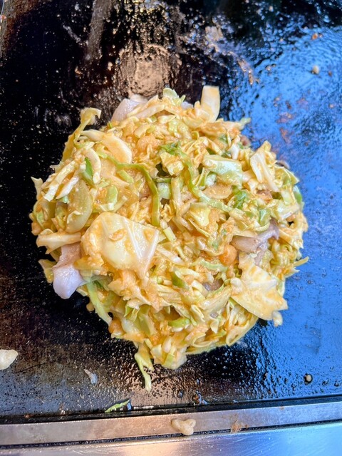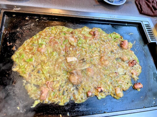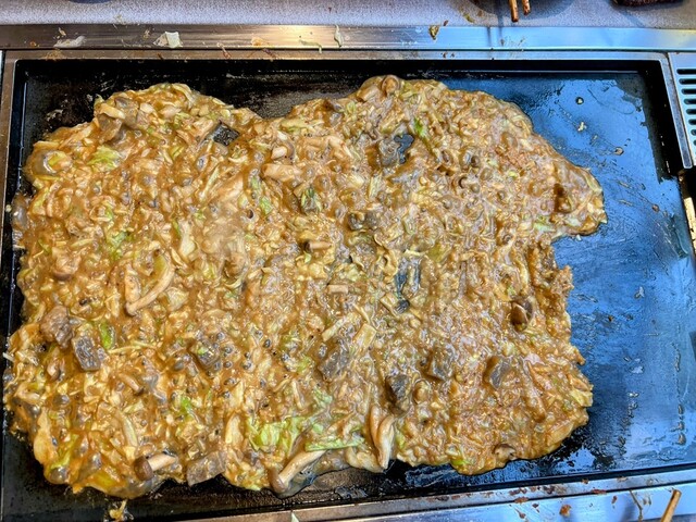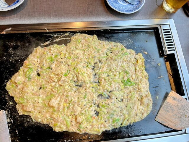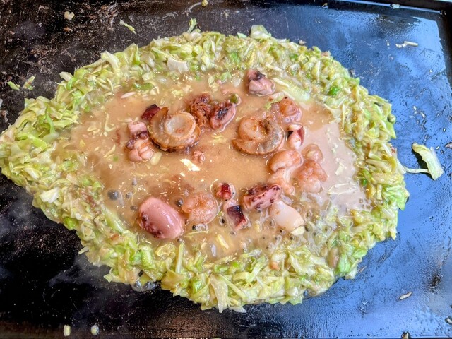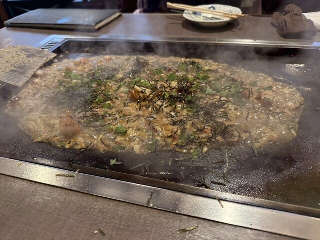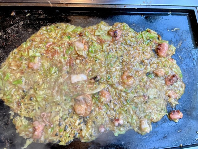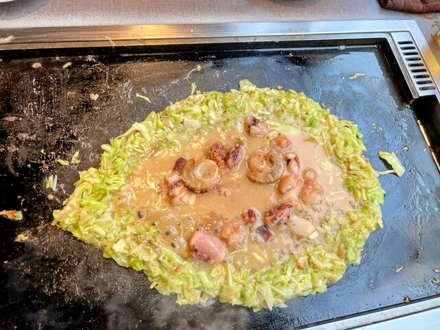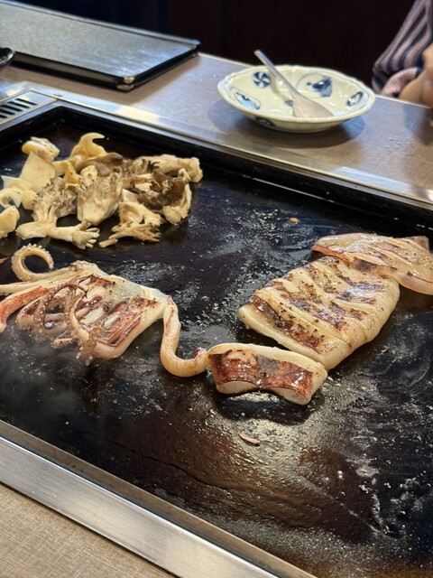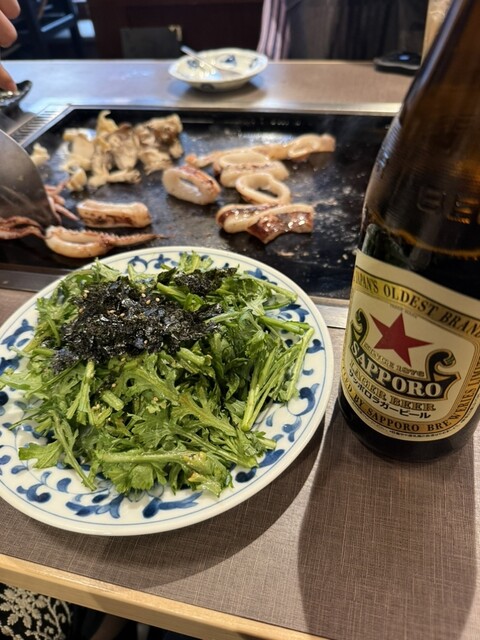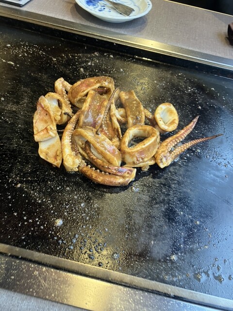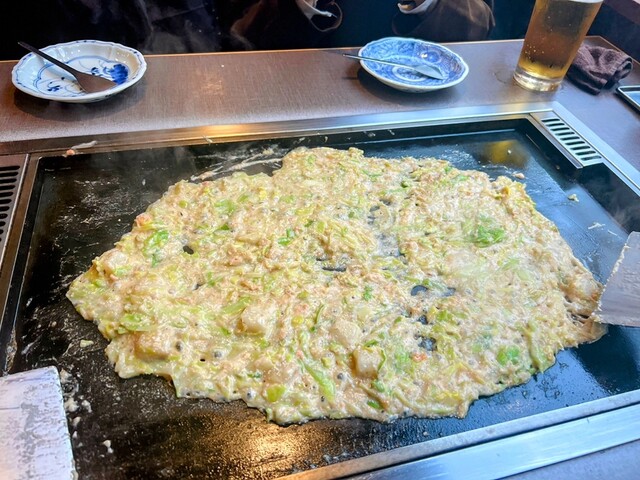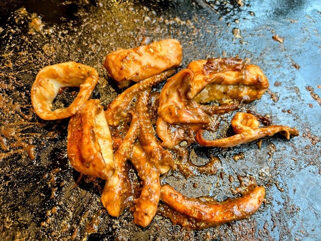 まずはホッピーと本日おススメというイカの丸焼きをオーダー。これは肝も絡めてくれる美味しいやつ。焼きたてで肝の珍味がすこぶる美味い。もんじゃは一番好きそうな明...