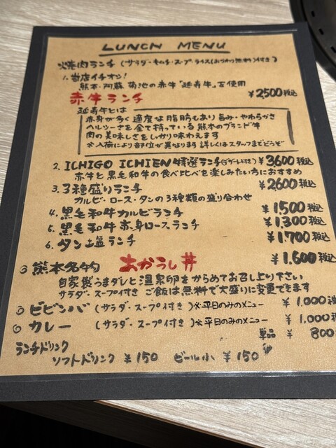 あか牛が食べられるお店がオープンしたとのことで、早速訪問!(サシの多いお肉より、適度なサシと旨みの強い赤身肉の方が好きな人です。)