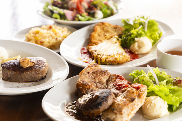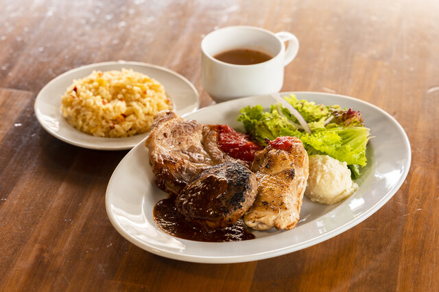 ランチは二種類のお肉(ハンバーグ+ポークorチキン)が楽しめるものと、本日のランチの3種類。 サラダとライス、スープがついてきます。 味は少し濃いめに感じましたが、ご飯に合うか... 詳細を見る