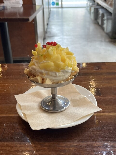 イートインのドリンクは後ろの黒板にあります、と言われて見たら、パイナップルのパブロヴァ900円があり、それに...