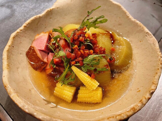 おっ!これは上品な煮込みがきた。透き通ったスープだ、優しい旨味は野菜のコンソメの様で魚系の旨味や塩梅も控えめ、大根も筋もしっかり別に調理され、この歯応えを狙っているのだろう。家庭料理ではない、しっかり勉強さ...