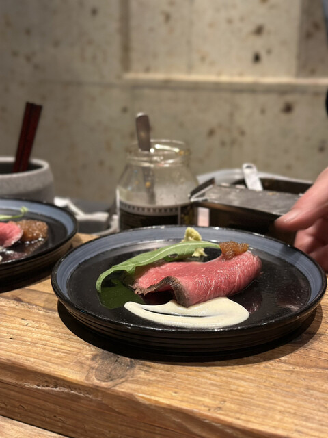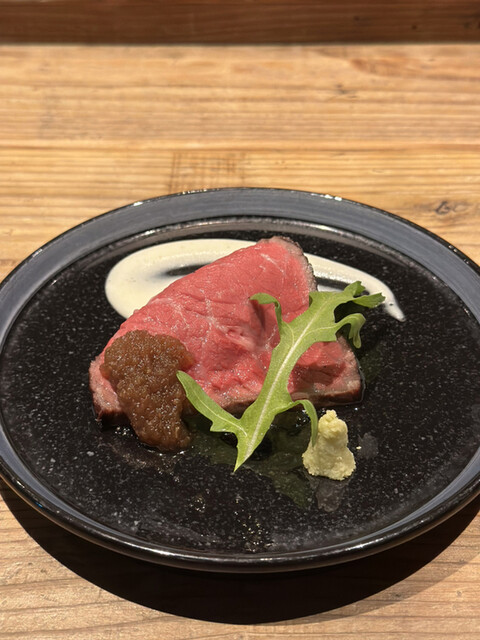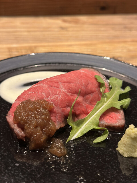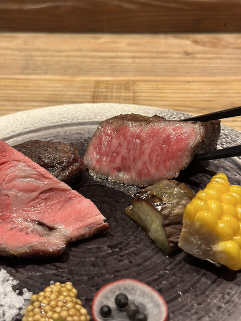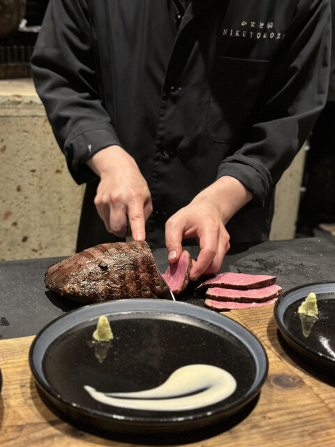 焼き上がった塊肉をスライスして綺麗な赤身が出てくる様子がたまりません。カウンター席ならではの醍醐味ですね。