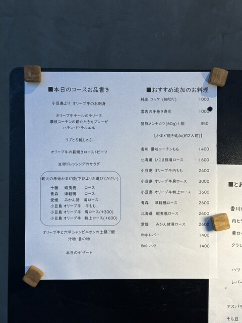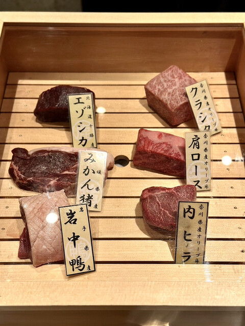 牛肉3種、鴨・猪・鹿と、ジビエも充実。牛肉の特上ロースと猪を注文しました。