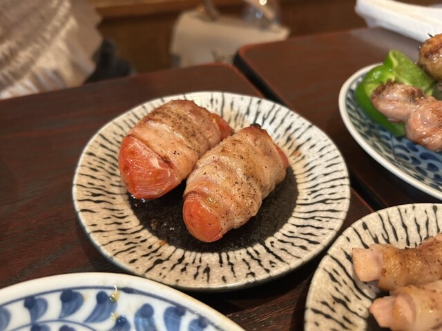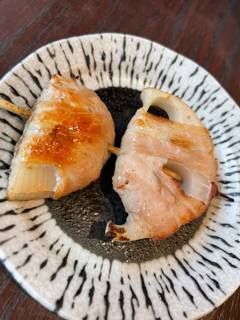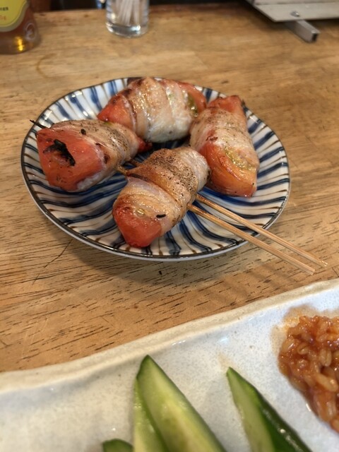 いつも定番の肉巻きレンコン、肉巻きトマト、ジャガバター、辛スープ、焼きおにぎりをオーダー。