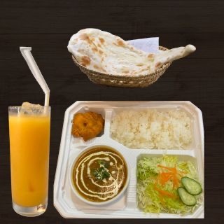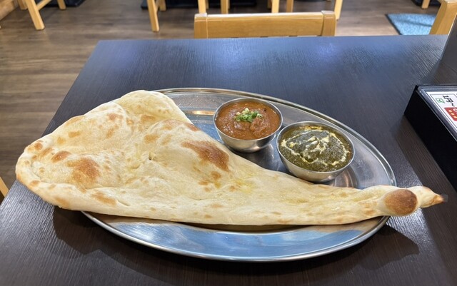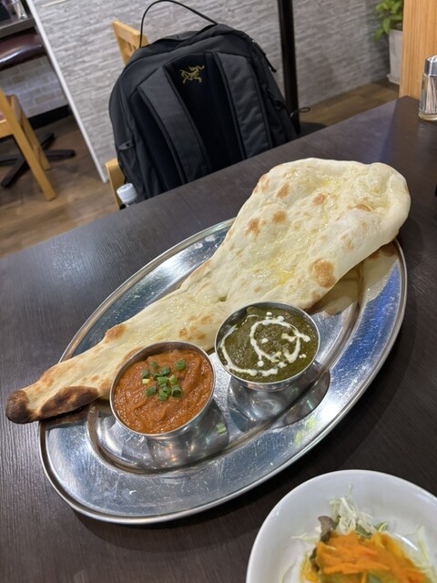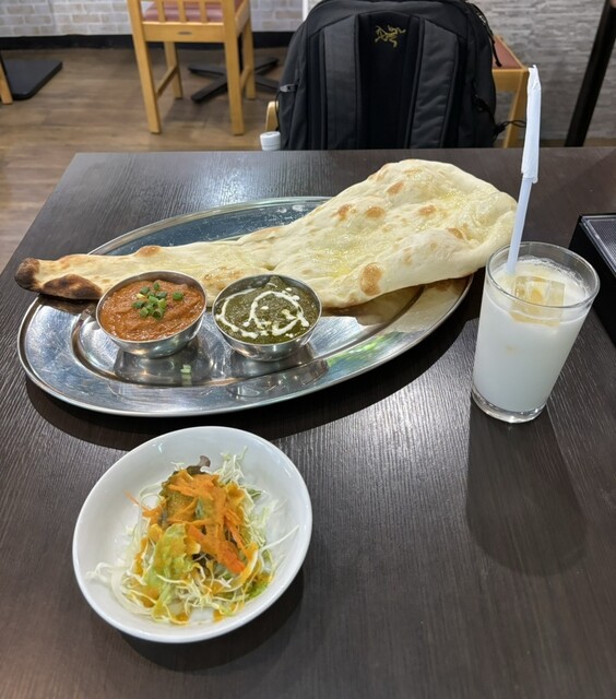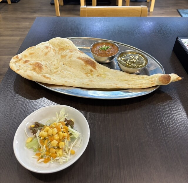 2種類のカレーが選べ、ナンorライス、サラダ、ドリンクが付いています。