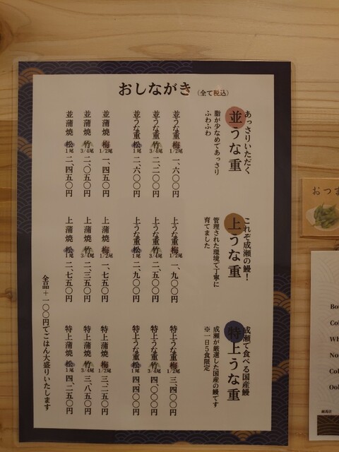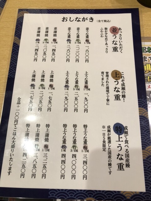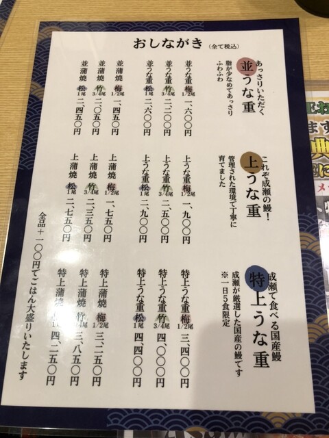 上、松、うな重2,900円税込み