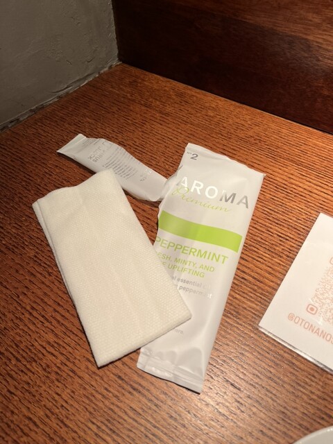 おしぼりが使い捨てなのに高いやつ使ってます。こういうこだわりいいですよね。ミントの香りがして厚手のやつでした。