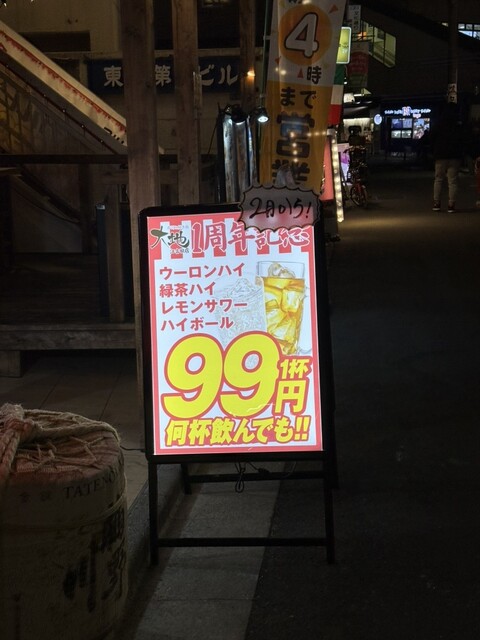 ひとり酒をしたくて転がり込んだ江古田駅前の居酒屋「大地」。表に1周年記念でハイボールなどが99円と出てたのも惹かれた理由。