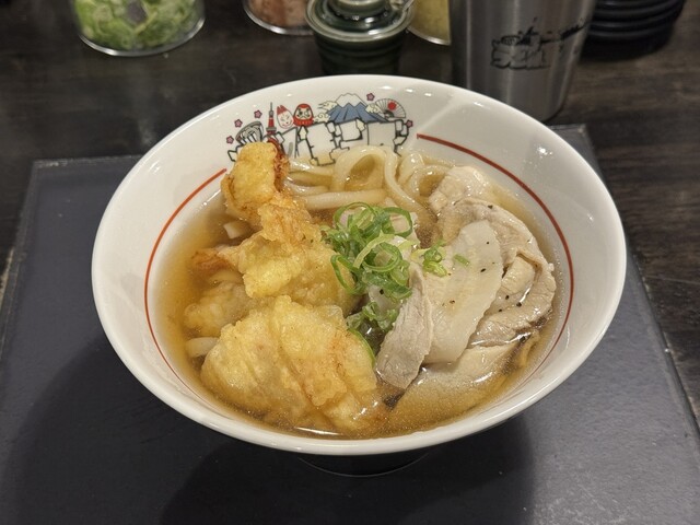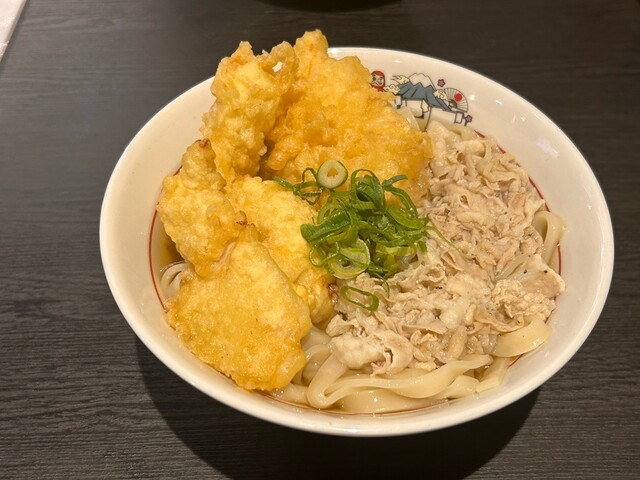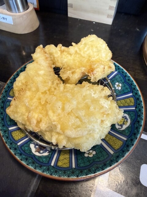 今回は釜揚げうどんにしてみた。毎回食べている舞茸天と今回初の竹輪天をポチッと。
