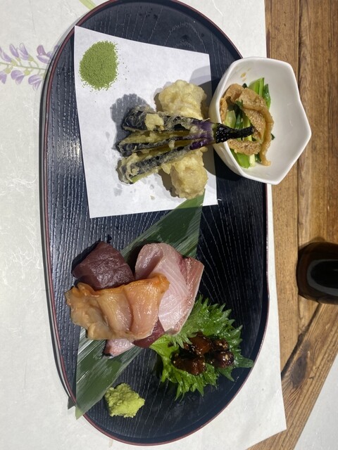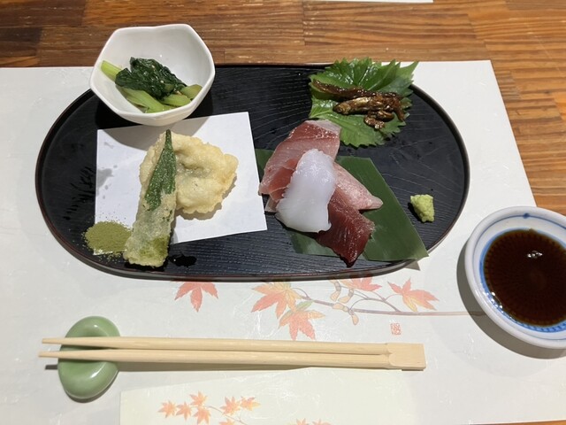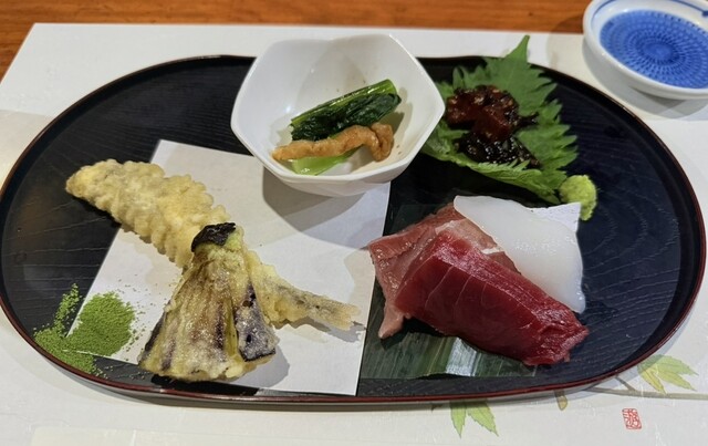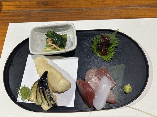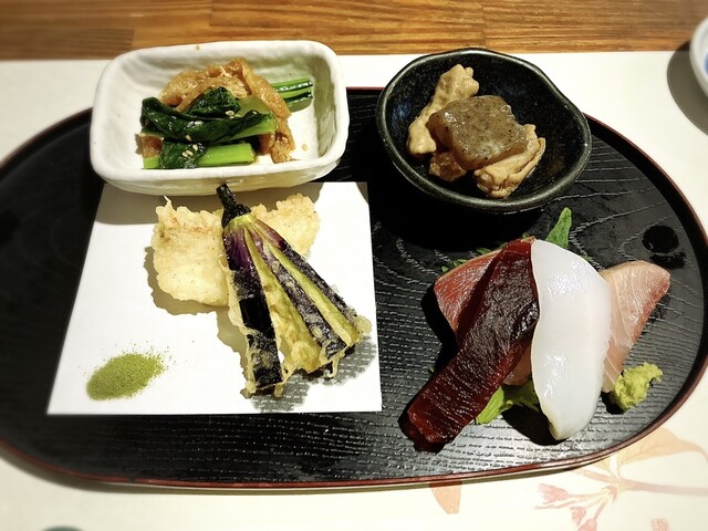 魚の天ぷら、茄子の天ぷら、もつ煮、お刺身、青菜など...