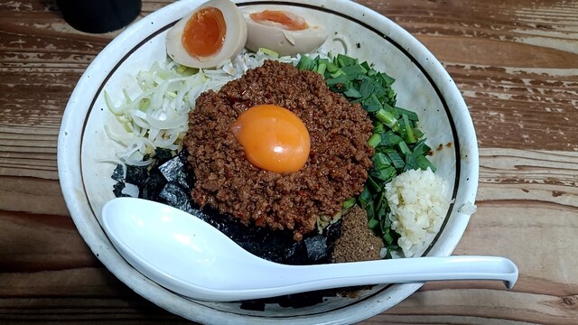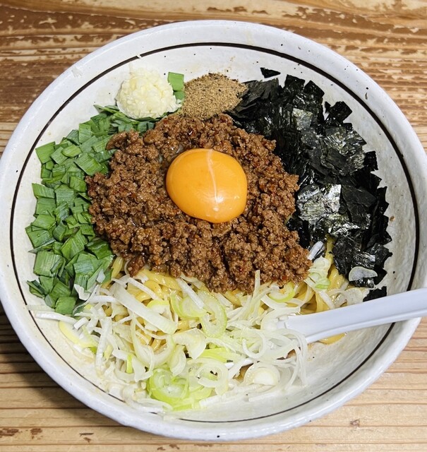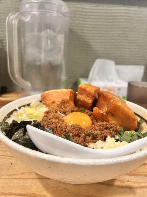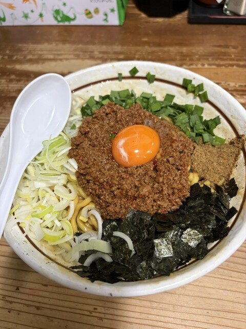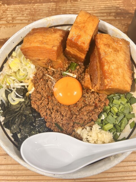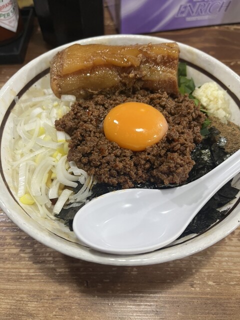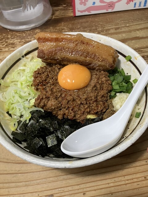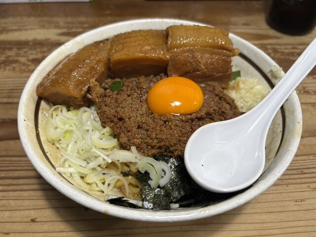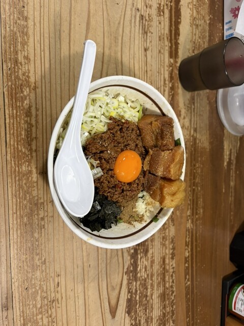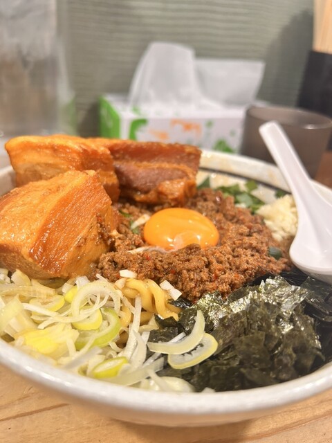 平日のお昼に初めて訪問しました。12:20頃にお店に入りましたが、4人程店内の待ち席に座ってました。食券を購入して待つ。客の回転も早く体感的には5分位でカウンター席(壁に向かってる席)に案内されました。壁には食べ方の貼り紙が。初見なので大変助かりまます。料理もそれほど待つことなく届きました。今回はノーマルな「【一番人気】まぜそば」を頼みました。綺麗盛られた具を下の麺と混ぜて行く。混ぜる作業が更に食...
