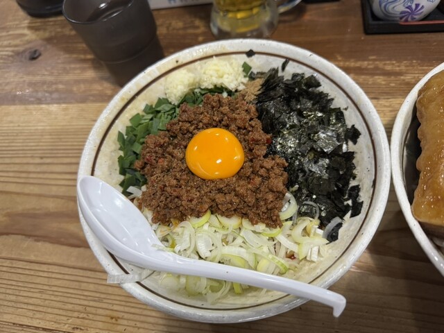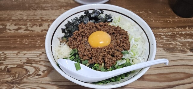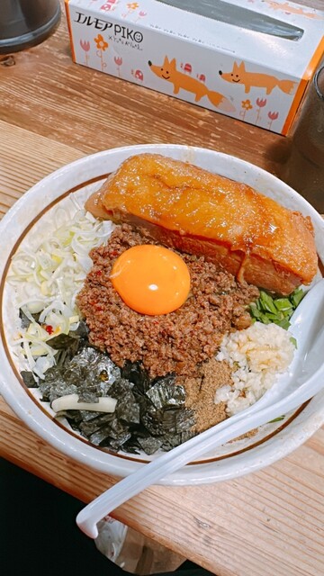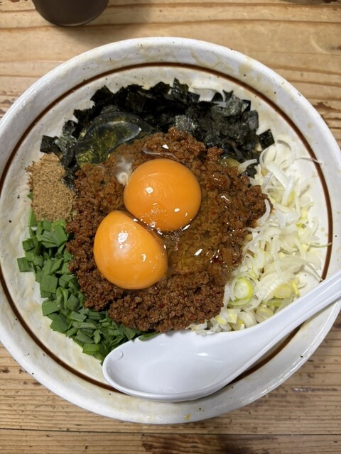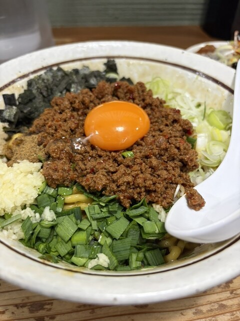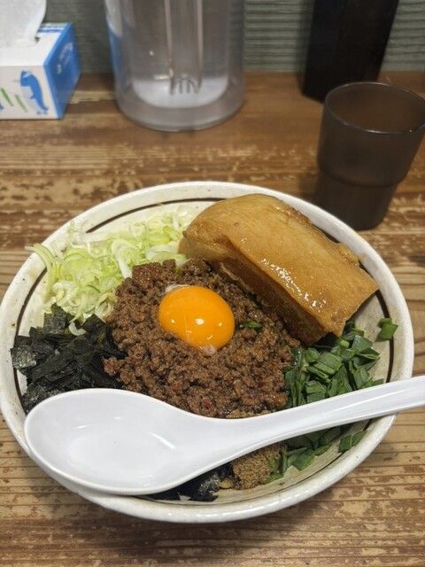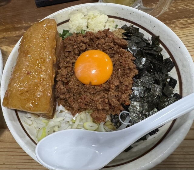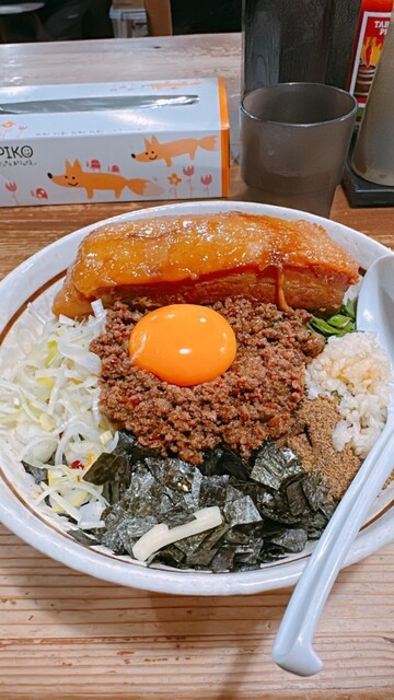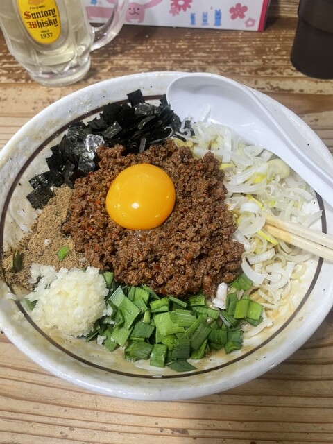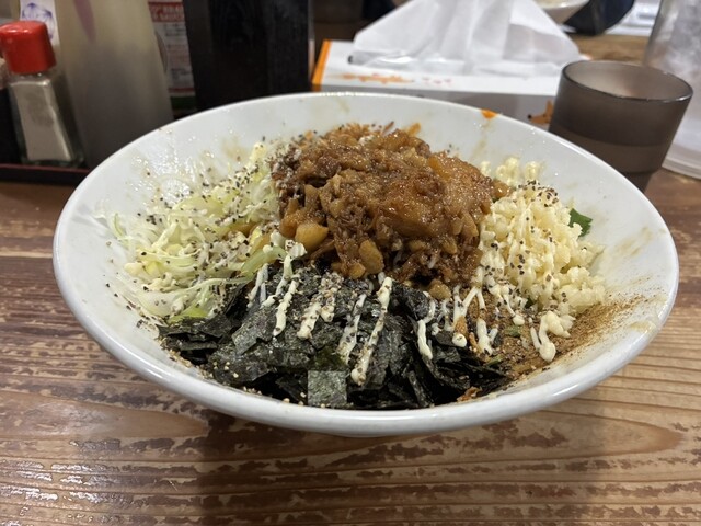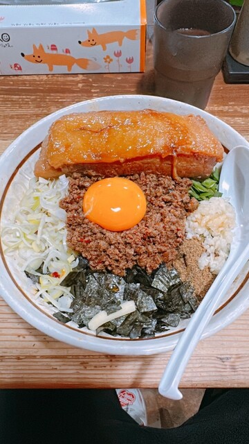 平日のお昼に初めて訪問しました。12:20頃にお店に入りましたが、4人程店内の待ち席に座ってました。食券を購入して待つ。客の回転も早く体感的には5分位でカウンター席(壁に向かってる席)に案内されました。壁には食べ方の貼り紙が。初見なので大変助かりまます。料理もそれほど待つことなく届きました。今回はノーマルな「【一番人気】まぜそば」を頼みました。綺麗盛られた具を下の麺と混ぜて行く。混ぜる作業が更に食...
