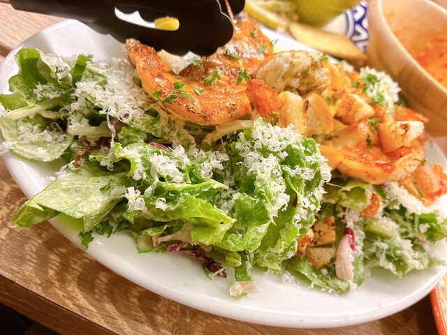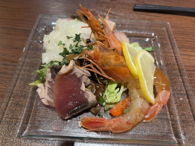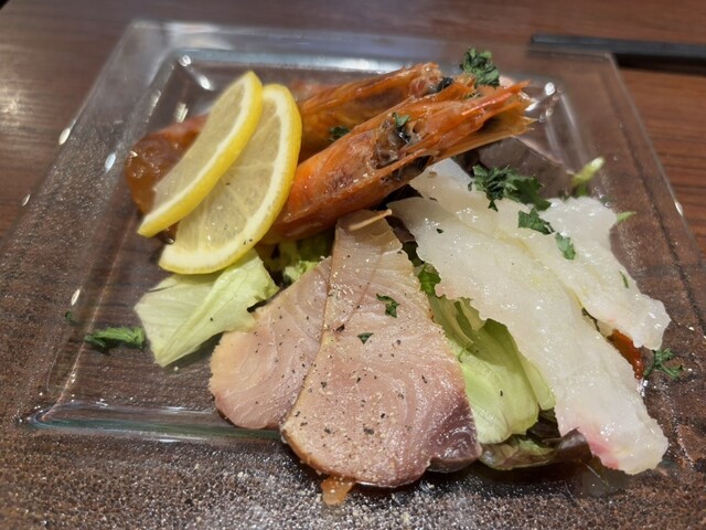 料理は、お通しは煮込み。小さなパンをつけて食べました。前菜5品盛りは少量が盛られたおつまみ。グリルエビのシーザーサラダは皮のついたエビがそのま...