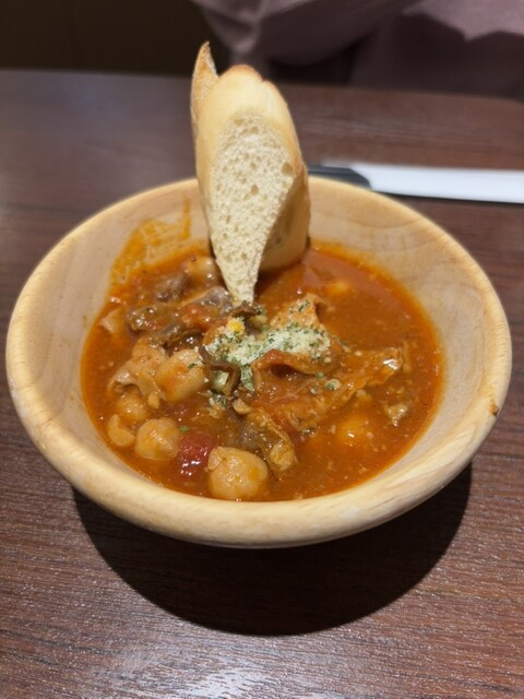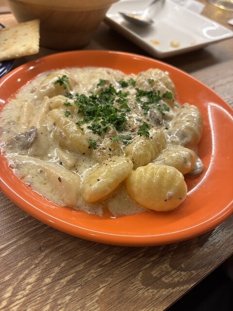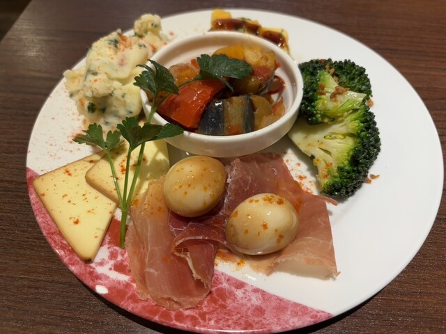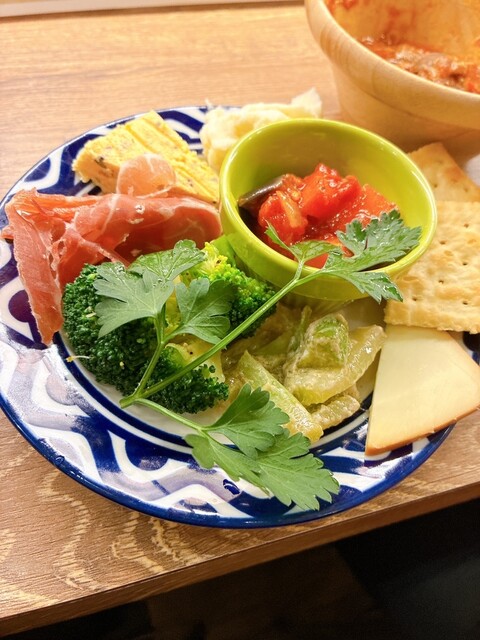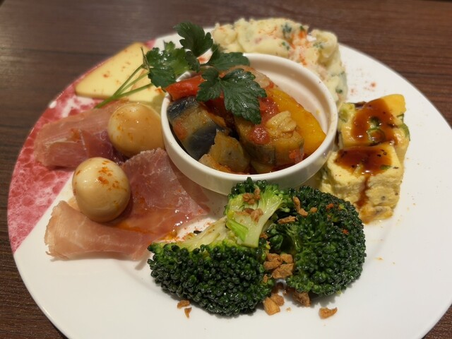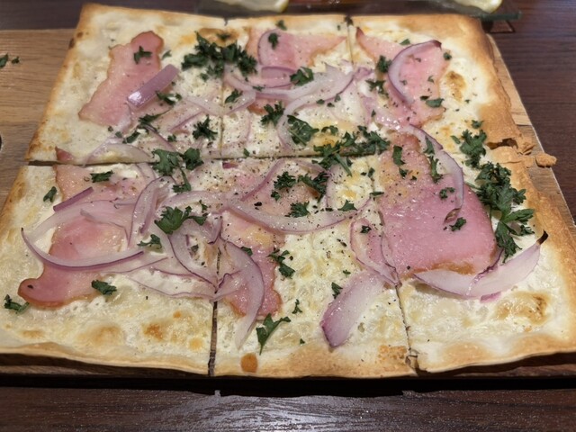 お昼にピザを食べたいと言われて探した結果ここのお店を選択。 平日限定昼飲みコースは1.5時間の飲み放題付き全6品 1人2,700円はかなりお得でお財布にも嬉しいコース。スパークリングワインで乾杯しながらサラダ、ラタトゥユ、マッシュポテト等お野菜、そしてトマトソース系のニョッキ、ラタトゥイユのオムレツ、ベーコンと玉ねぎのタルトフランベ…タルトと言ってもお菓子ではなくフランス発祥の四角い薄焼きピザ。... 詳細を見る