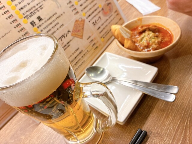週末18:30に予約して訪問。明るくポップな感じの店内。カウンター席やテーブル席はほぼ女性で満席。人気ありますね。席に座りメニューを見て口頭で注文しました。 ドリンクはビール、ワ... 詳細を見る
