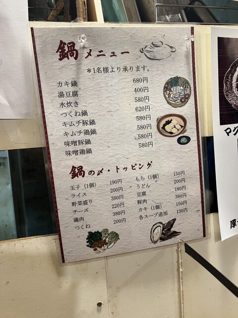 | ドリンク | 日本酒あり、焼酎あり、ワインあり、焼酎にこだわる |