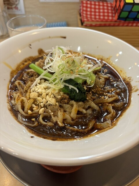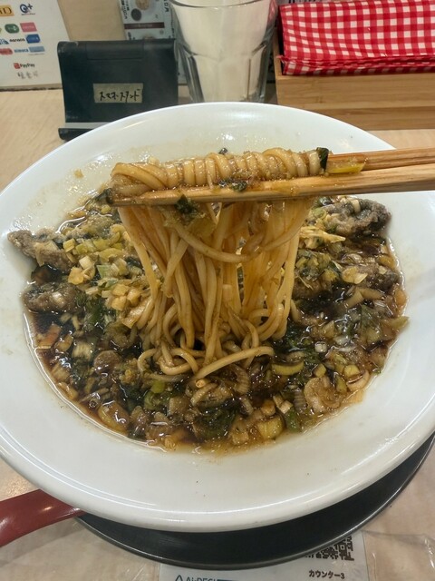 はじめて伺いました。都立家政駅歩いて1分。6人くらい待ってて、10分程で入店。テーブルにあるQRコードで注文。汁なし担々麺1200円。無料で麺大盛りもできるようです。濃い色のドロドロスープに太ちぢれ麺...