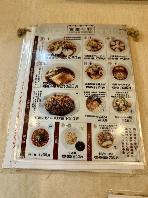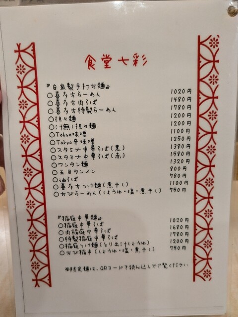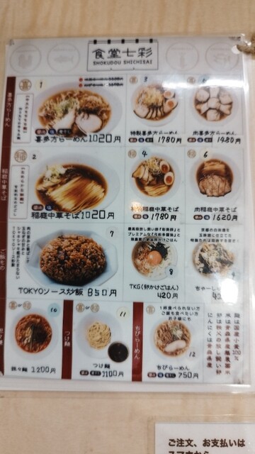 食堂七彩は、打ちたて・茹でたての自家製麺が楽しめる人気のラーメン店。注文後に麺を手打ちするライブ感があり、もちもちとした食感が魅力です。スープは無化調ながら深い旨味があり、醤油の香りと...