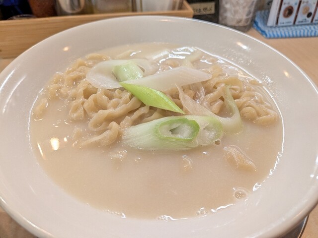 円やかな鶏白湯スープで煮込ませた手打ちの極太縮れ麺。鶏...