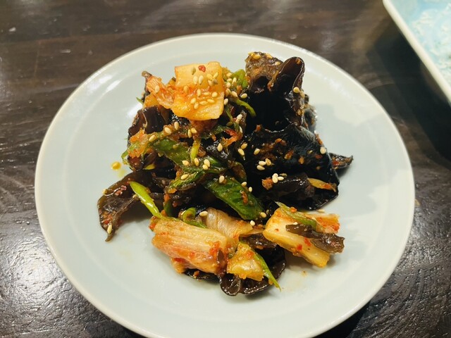 先に届いたセロリの白キムチ漬けをあてに生ビールをいただきながら...