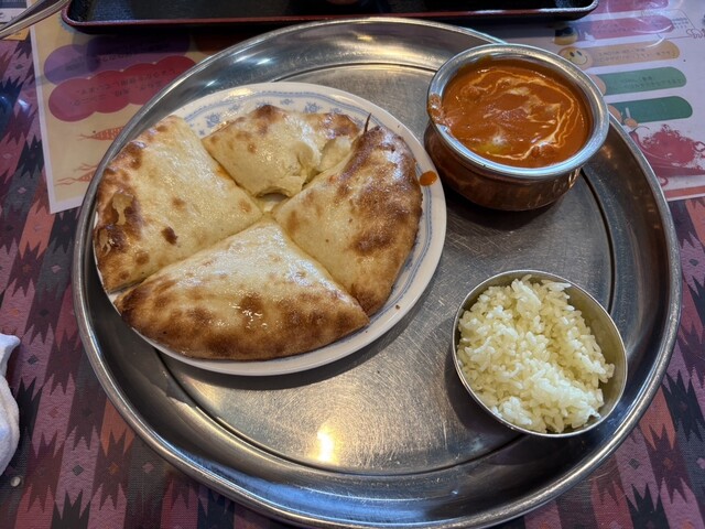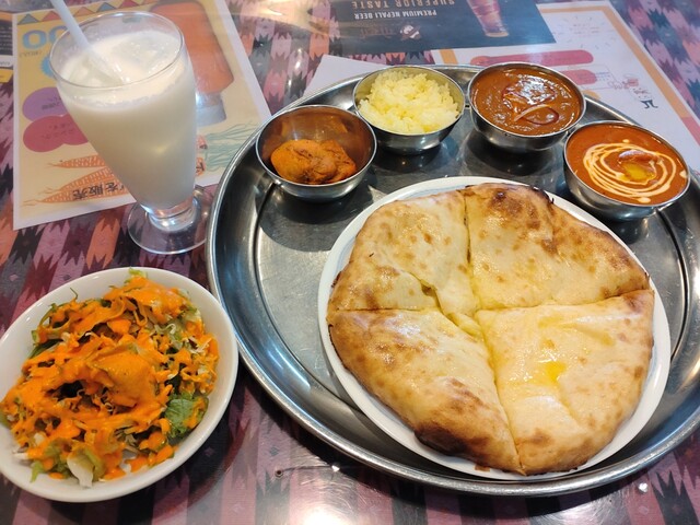 (バターチキン、チーズナン、サラダ、ライス、ラッシー)