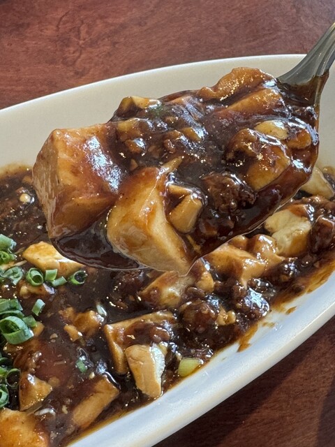 醤油味がしっかり効いた、かためな餡の麻婆豆腐。