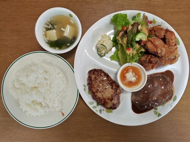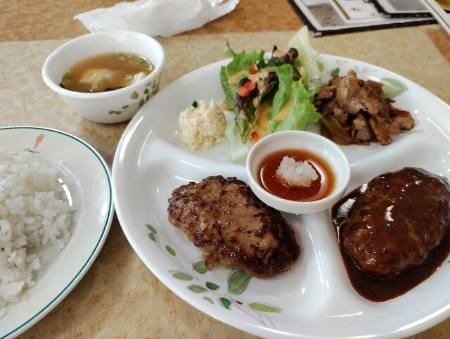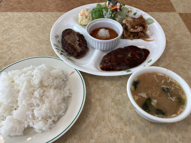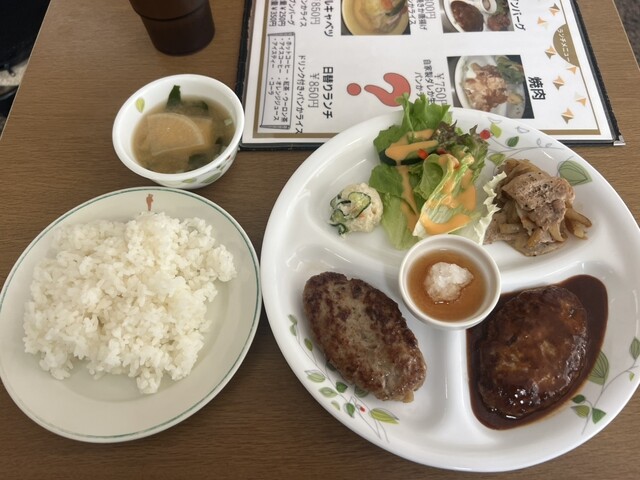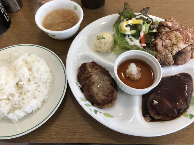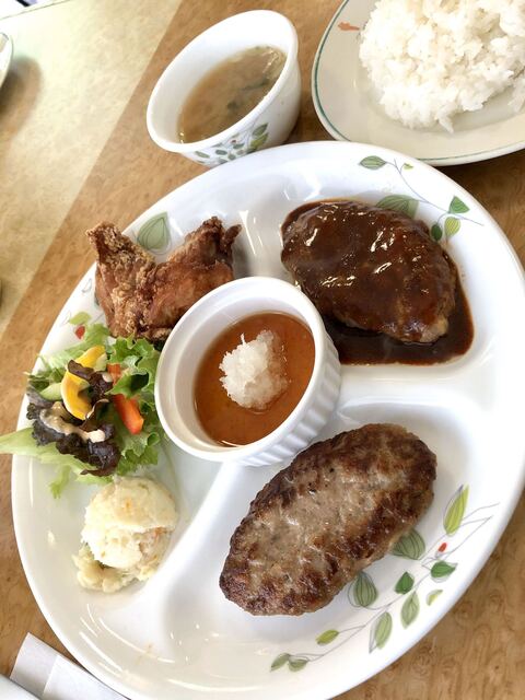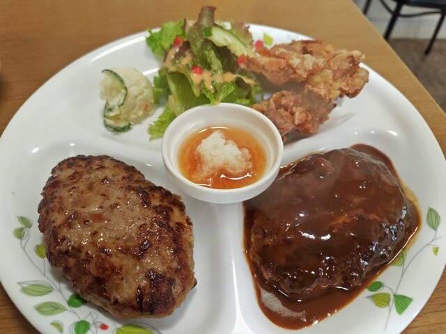 屋号にもなっているハンブンバーグをオーダーした。ランチは唐揚げか生姜焼きの...