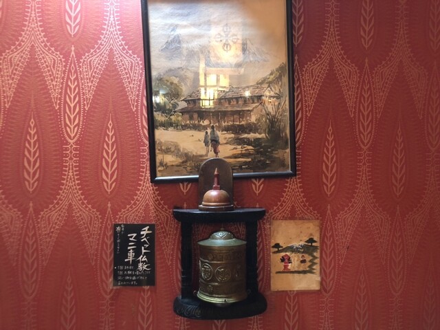 お店の奥に案内され壁際のテーブルへ。そこでチベットの鐘、マニ車なるもの発見。右手でゆっくり一回優しく混ぜると一回お経を唱えたことになる?さっそく回してお祈り。