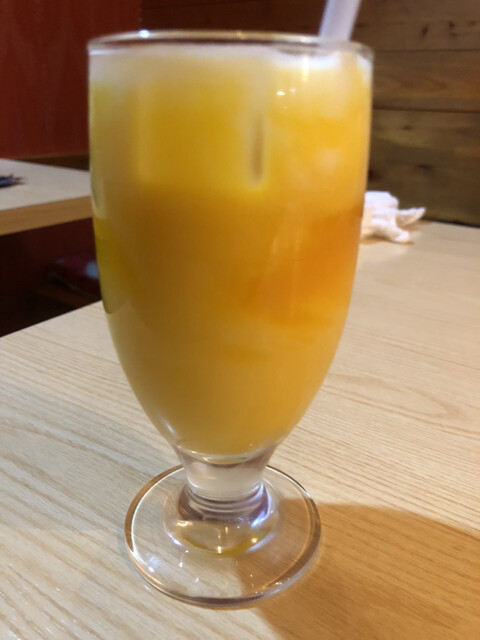 メニューがたくさんあって悩みましたが、先ずはマンゴーラッシーを注文。濃厚な一品で氷が少なく、クルクルさせて冷やしながらストローで飲みます。味も濃く甘さも十分あります。カレー味をマイルドにするかも?