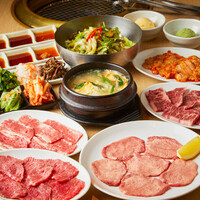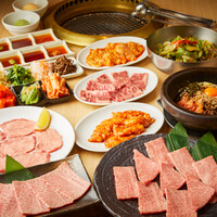 自慢の黒毛和牛をコースでリーズナブルにお楽しみいただけます。焼肉の定番「カルビ」や、きめが細かく旨味たっぷりの赤身「ロース」、肉の旨みをしっかりと感じられる「特選ハラミ」、あっさりとした「タン塩」など、自慢の部位が勢揃い!他にも、新鮮ぷりっぷりのホルモンや玉子クッパなど、全10品をご用意いたします。 +1,800円で《120分飲み放題付》に変更可能です。誕生日や記念日のお祝い、接待・会食など、各種宴会にぜひご予約ください。