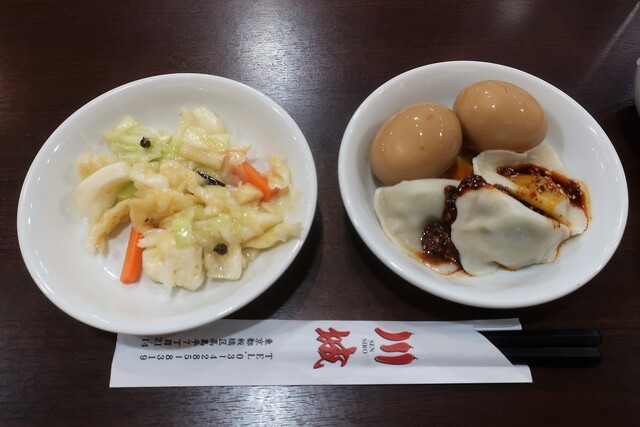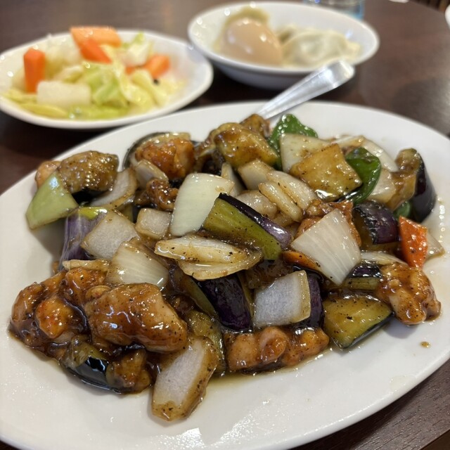 今日は鶏肉と茄子炒めをいただきました。味玉、煮玉子、水餃子、漬物サラダが付いてなら納得の価格。