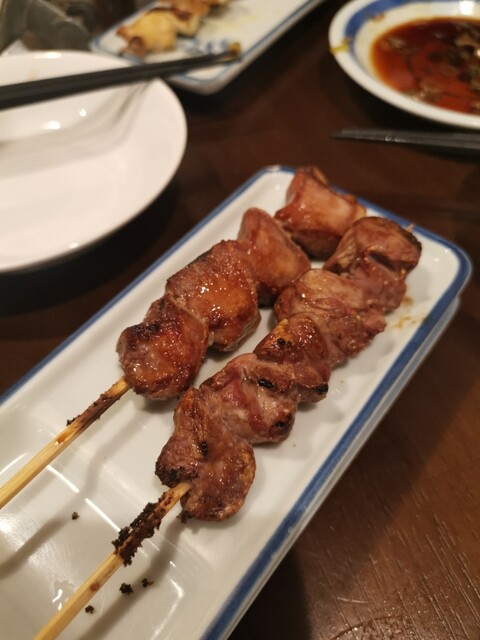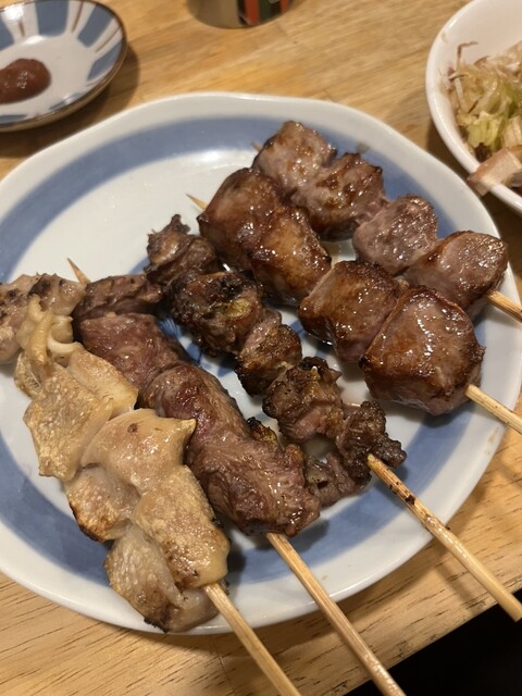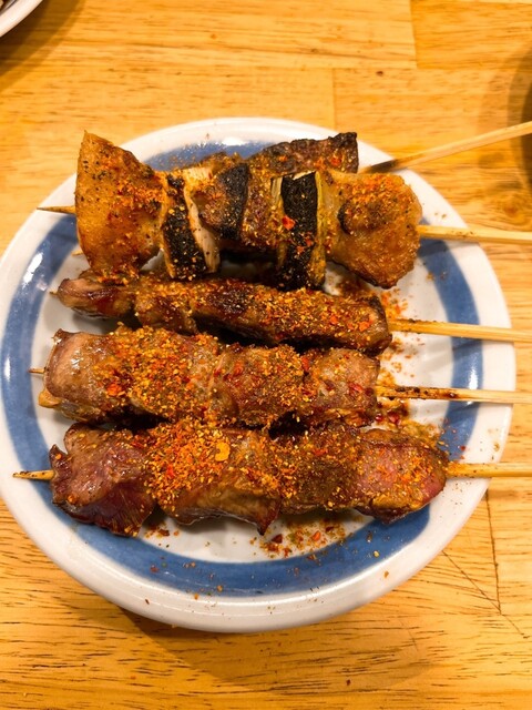 串焼きでレバー、はつ、ガツ、はらみ、タン、はつもと