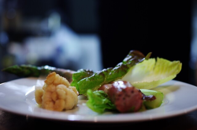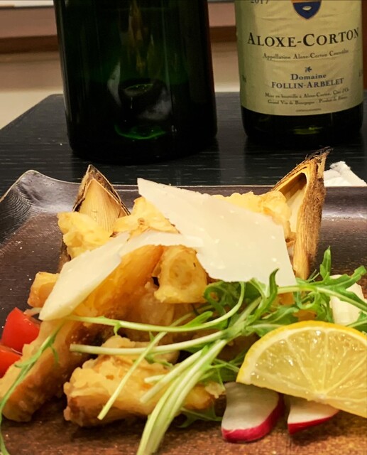 先付けはホワイトレバーのパティ。 独特の風味がそそります。 ・ホワイトアスパラのミラノ風 ホワイトアスパラに生ハムが巻かれており、ポーチドエッグ?をソースのように絡めて... 詳細を見る