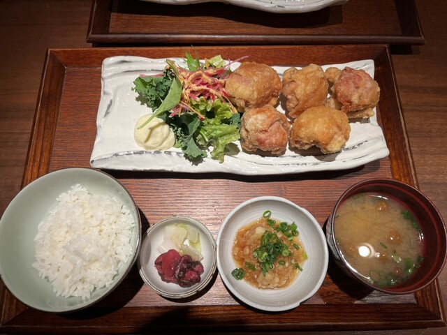 久しぶりの訪問。豚バラ焼肉膳(1,320円)ととり唐揚げ膳(1,320円)を注文。前菜3種は、小松菜と油揚のおひたし、なすの煮浸し、煮豆。小松菜がシャキシャキでおいしい。メインの豚バラ焼肉は脂身が少なくて食べやすい。しょっぱすぎずいい味付け。胡麻の風味も効いてる〜!温泉玉子を添えていただくと味変できてなおお得感。