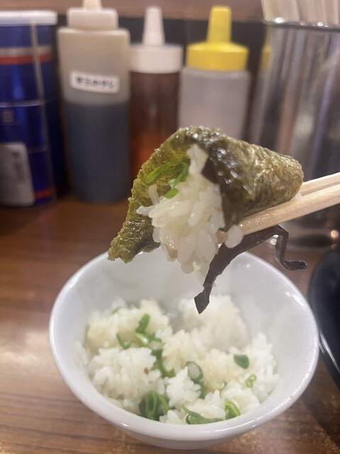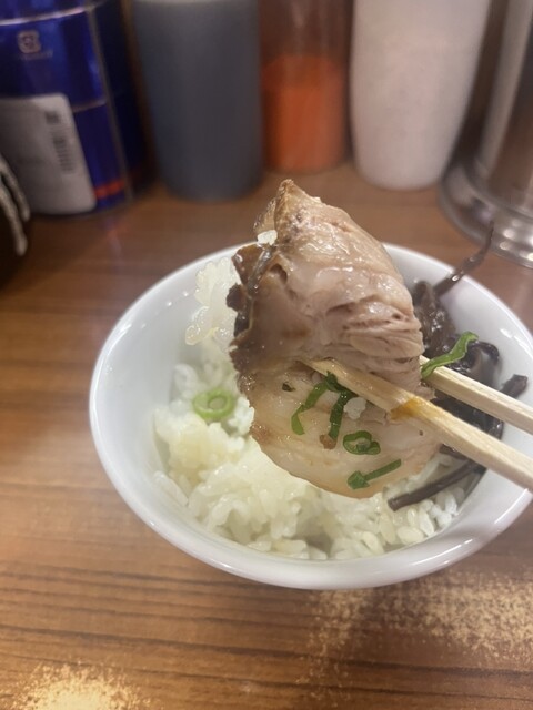 まずはネギラーメンからチャーシューをライスに移す。チャーシューはご飯と一緒に食べるのが断然旨い。ネギとキクラゲも少々添えてミニチャーシュー丼を完成させる。