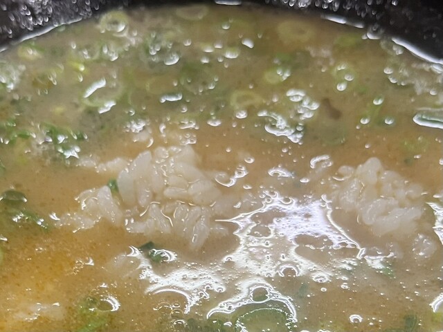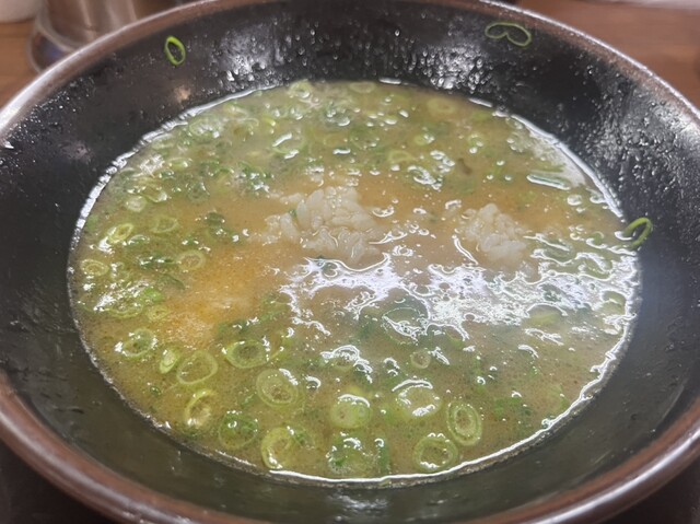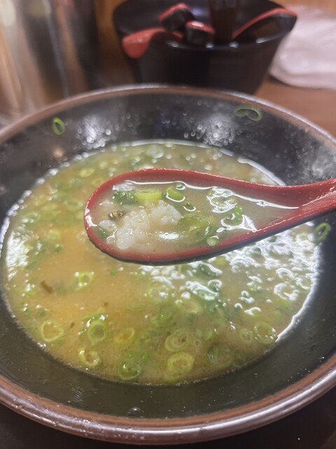 先にラーメンの麺をきれいに平らげる。スープに残しておいたライスを全部投入。極上の豚骨スープ雑炊が完成。たっぷりのスープに少量のご飯でバランス悪く見えるが、これがベスト。