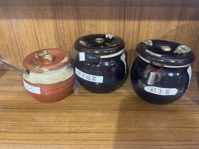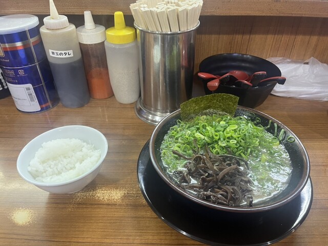 博多ラーメンは提供が早い。2分ほどでネギがたっぷり添えられた“ネギラーメン”が“小ライス”と一緒に供される。すぐに卓上常備の“にんにく”と“辛子高菜”を適量投入。食べる準備を整える。