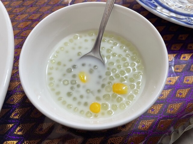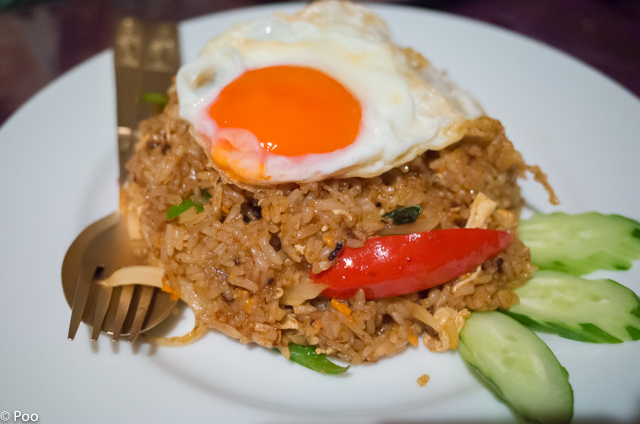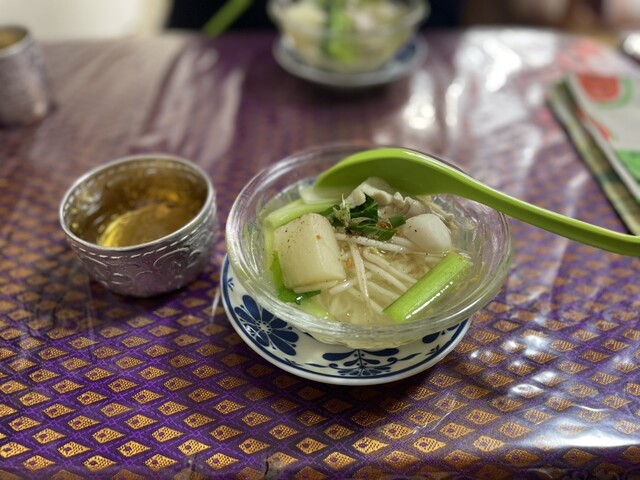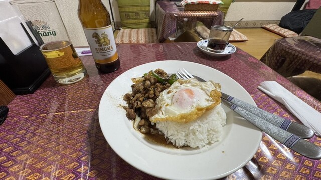 ガラッと戸を開けて、厨房のタイ人のおばちゃんに、お一人様である事を告げますと、そこの席でも2階でも良いですよと言われ、入り口すぐそこの狭いカ...