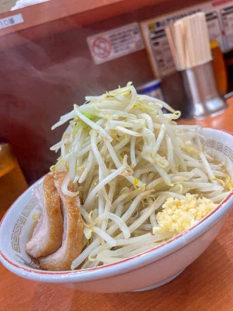 席に座ると二郎系らしく、食券を渡してからコールの確認。野菜やニンニク、アブラの量を自分好みに調整できるのが面白いところですね。今回は昼だったのでニンニクは控えめにし、野菜はちょい増しにしました。山盛りのもやしとキャベツの上にアブラがのり、その下からは極太のワシワシ麺がどっしり構えていて、ビジュアルからして食欲をそそります。