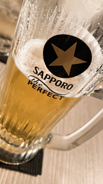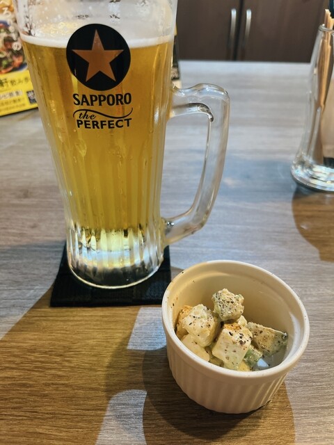 せんべろセット(飲み物2杯におつまみ1つで1000円)がお得だなとチェックしていたお店、まずは生から。パーフェクト黒ラベルの認定店とのことで、泡の具合から安心感あります☆飲んだ後にグラスにできる輪っか(エンジェルリングと言うらしい)は鮮度管理とグラスの洗浄がしっかりしている証...