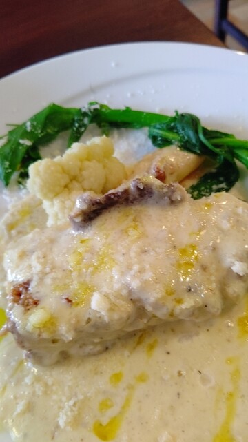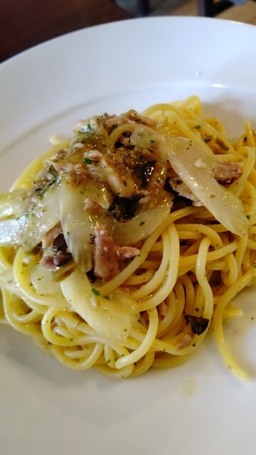 週替わりのランチパスタ3種はオイル、トマト、クリームとあって900円(クリームは950円)。大盛無料。さらにランチAセットは200円でサラダ、ドリンク、デザートが付く。破格だわー。さらにお冷もガス入りの水が選べる。