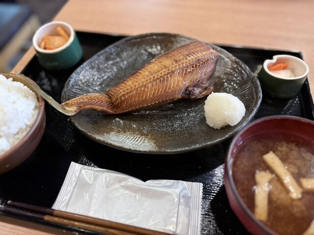 3種の刺身に小鉢料理、ご飯、味噌汁、漬物が付く定食。