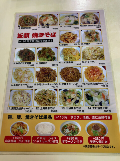 飯類とやきそばに、+110円でサラダ、漬物、杏仁豆腐、+150円で麻婆豆腐(小)、+200円でライスor半チャーハン、+280円で半ラーメン、+380円で半担々麺を付ける事ができる。