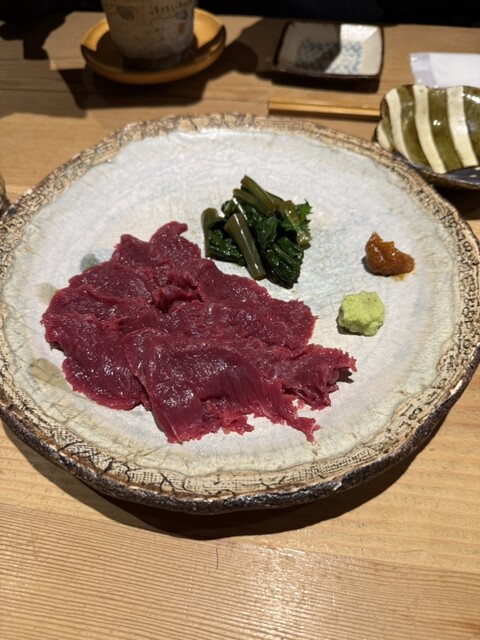 まずは馬刺し。臭みなし、たっぷりの薬味と。美味しい...
