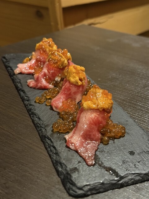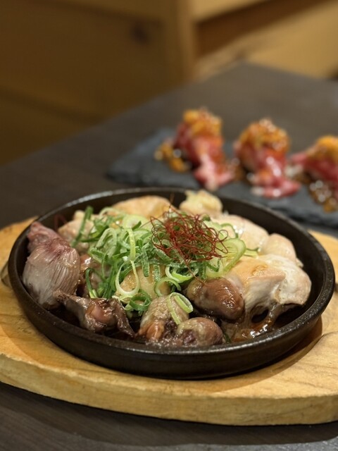 オーダーしたのは鉄板焼き鶏、和牛握り等が堪能できるコース。...