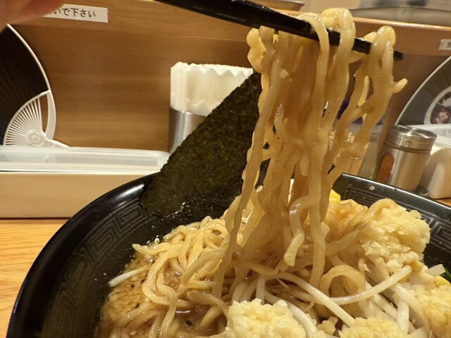 しっかり太めのちぢれ麺にこってり濃い味のスープが絡む