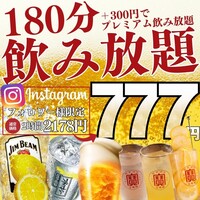 3時間飲み放題でオールタイムOK!777円はお得すぎます◎+300円でプレミアム飲み放題に変更も可能です!※お料理はお一人様3品以上ご注文くださいます様よろしくお願い致します!※日~木限定