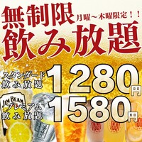 11/30まで●無制限飲み放題●【月~木限定】スタンダード1280円(1408)/プレミアム1580円(1738)