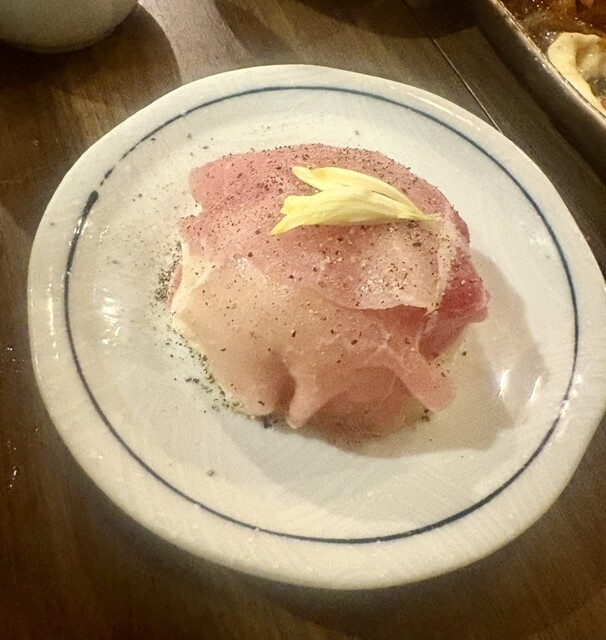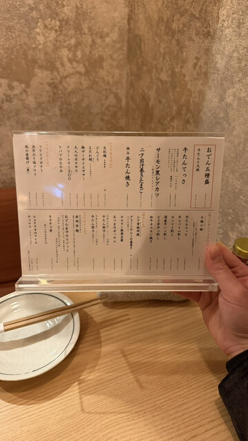 お通しはもつ煮込み。じっくり煮込まれたもつと、味が染み染みの根菜たちが最高。これがなん...