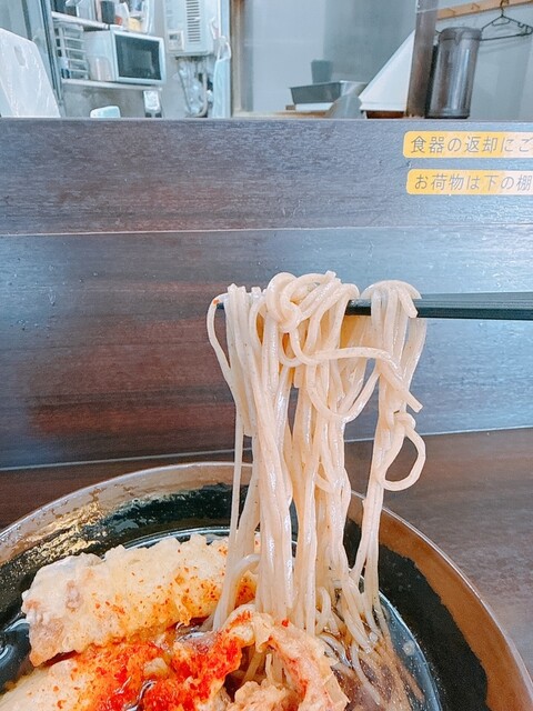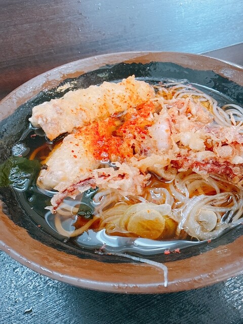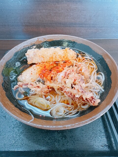 まぁまぁ、立ち食いそば屋なんだろう?という先入観で行くと、期待を良い意味で裏切ってくれる。どて煮丼温そばセット(780円)にゲソ天(210円)と舞茸天(160円)を注文したのだが、そもそもどて煮丼自体が立ち食いそば屋には稀な存在だから。そばは一般のそば屋が出す、スルリと喉を通る細さと優しい出汁の甘み... 詳細を見る